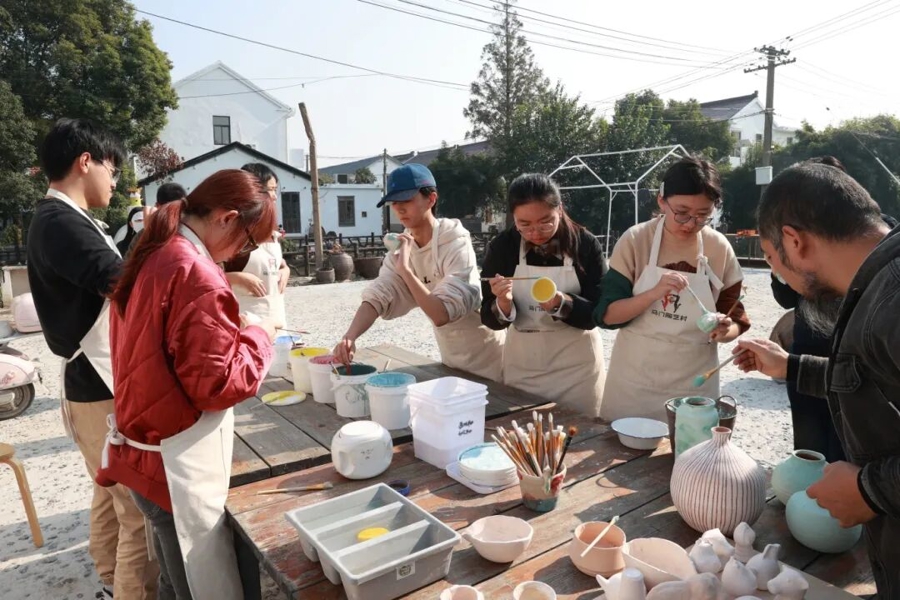 这两年,高校和艺术类院校也发现了这块宝地。从复旦大学服务学习教育实践基地,到韩国弘益大学海外校友会陶艺创作基地,再到上海工艺美术职业学院陶瓷材料美学创新基地,马门陶艺共享中心已成为艺术专业学生的校外实训场,为师生共创提供源源不断的灵感。