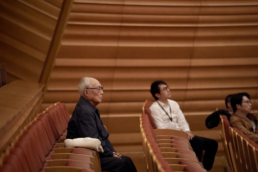《红旗颂》首演前排练,吕其明(左)仔细聆听每个音符