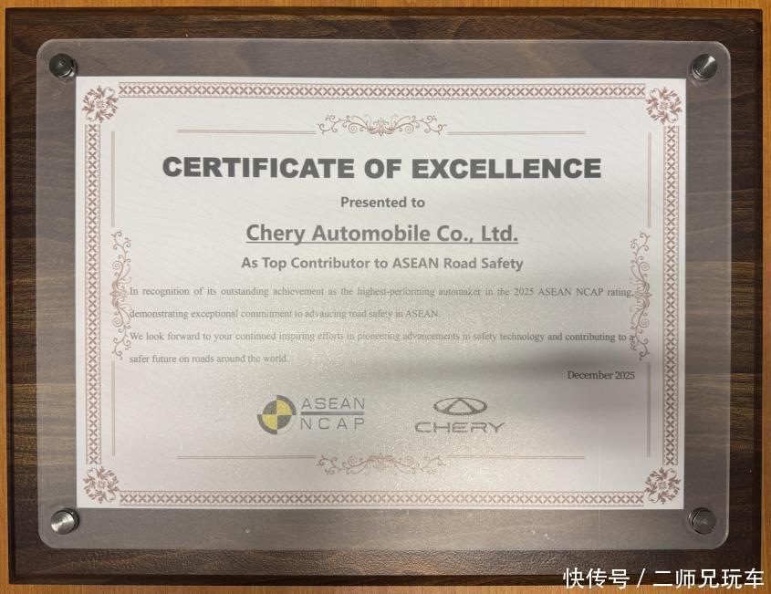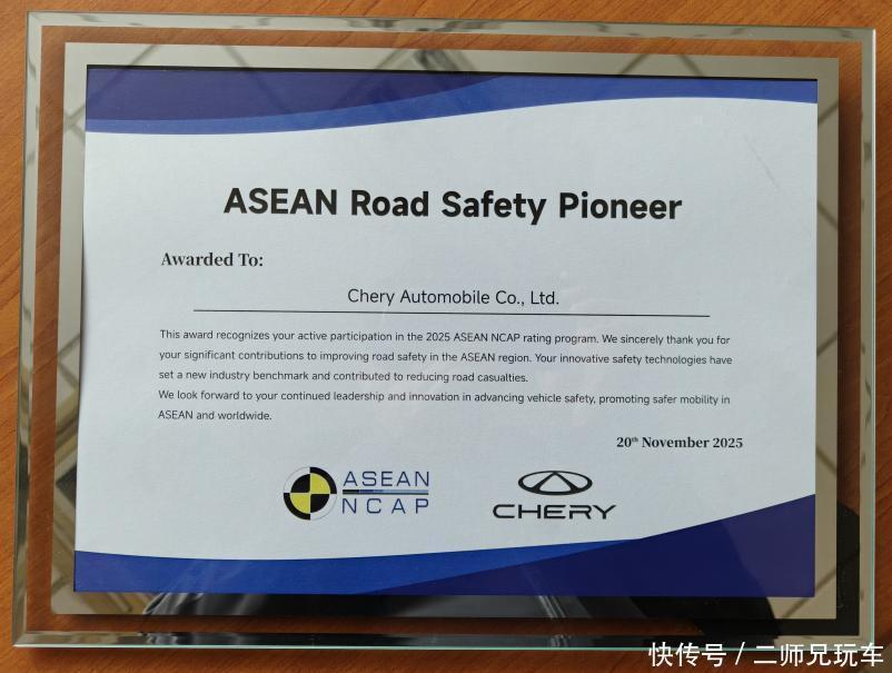 图为ASEAN NCAP官方授予奇瑞汽车“东盟道路安全先锋奖”