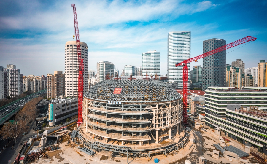 新民晚报记者在现场看到,这个重达252吨的“钢屋盖”与周边的钢结构网壳合龙后,“明珠”造型已初具雏形。上海建工机施集团项目经理刘轩介绍,此次提升的采光顶是个跨度达84米、整体呈曲面形状的超大跨度单层网壳。施工期间,面对场地受限、工期紧张、安装精度要求高等多重挑战,项目团队创新施工工法,将穹顶网壳分区拆解为整体提升系统单元与外围拼装单元两部分。两个区域同步进行拼装工作,高效推进施工进程。